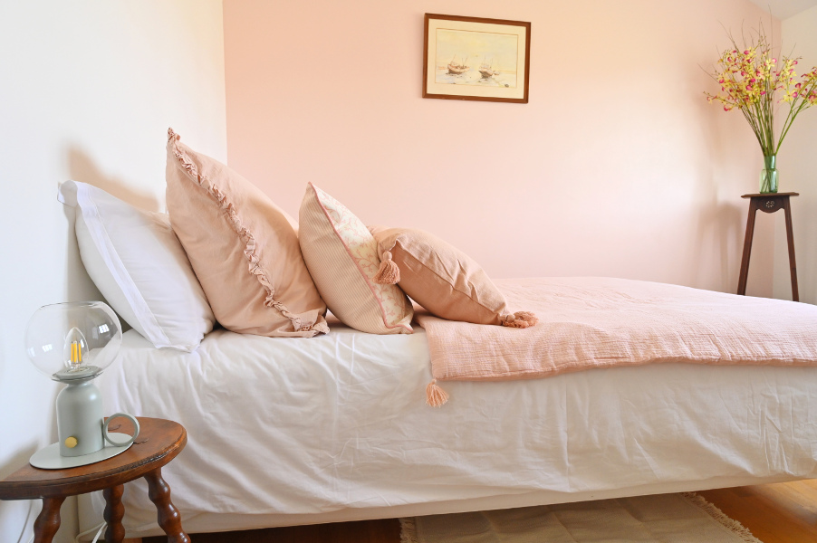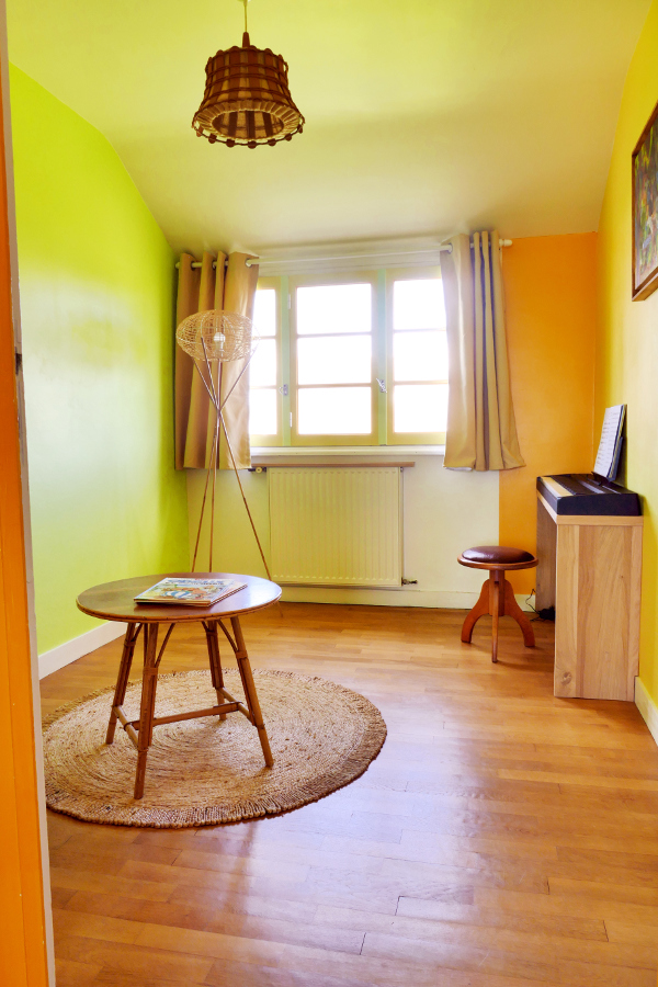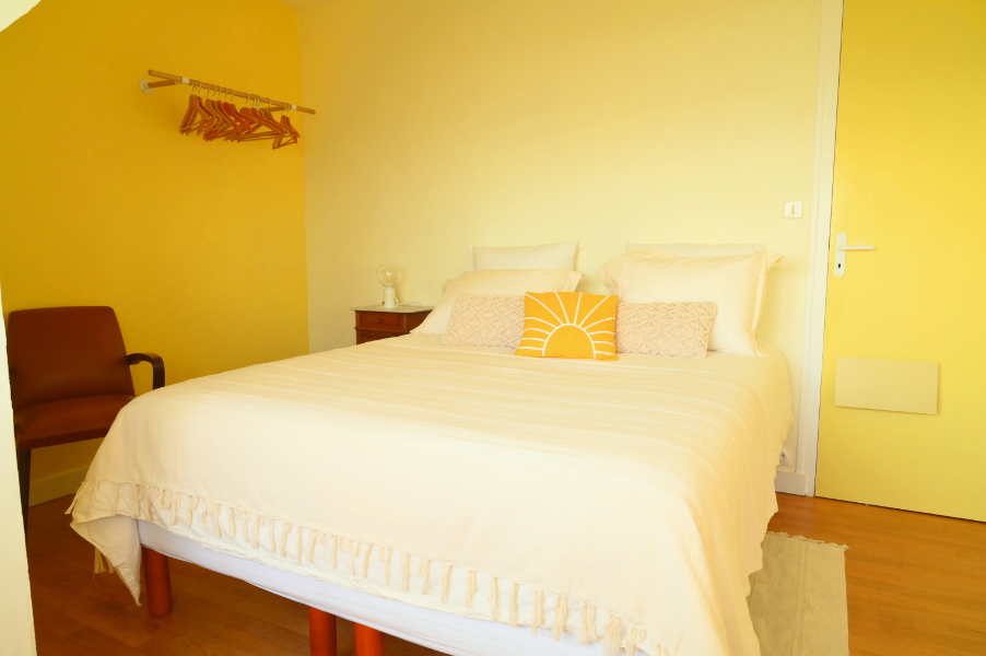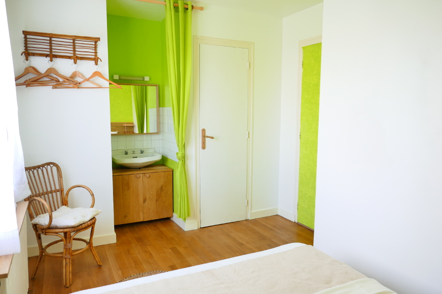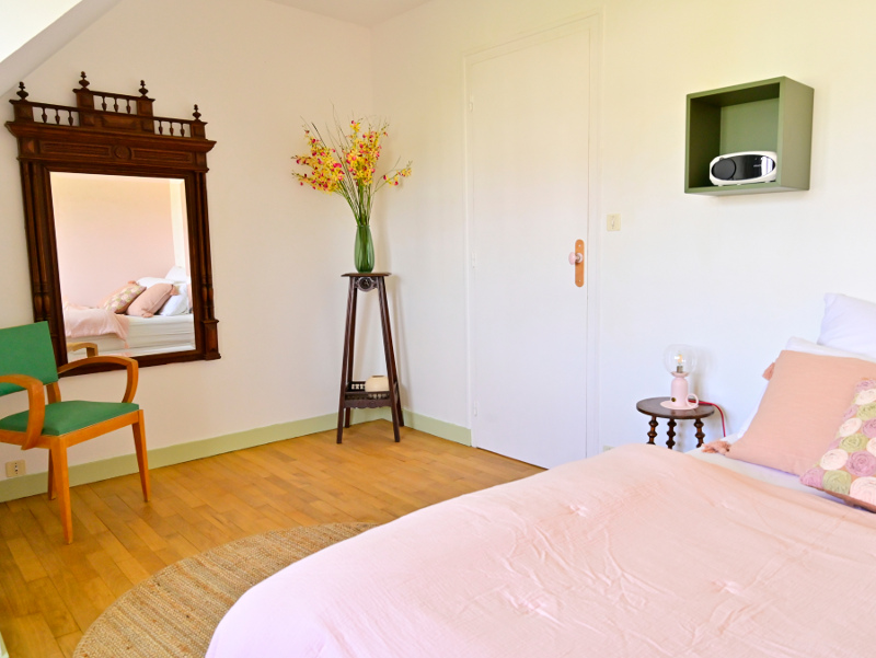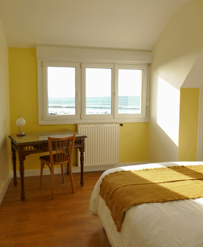 Vom Vorraum mit Garderobe führt eine sichere Holztreppe in die obere Etage. Hier liegt ein weiteres Schlafzimmer, das mit Doppelbett (160 x 200 cm), eine Kommode, eine Wandgarderobe sowie einem bretonischen Schreibtisch am Fenster zum Meer eingerichtet ist. Daneben gibt es ein Badezimmer mit seitlichem Meerblick, Badewanne und einer weiteren Toilette.