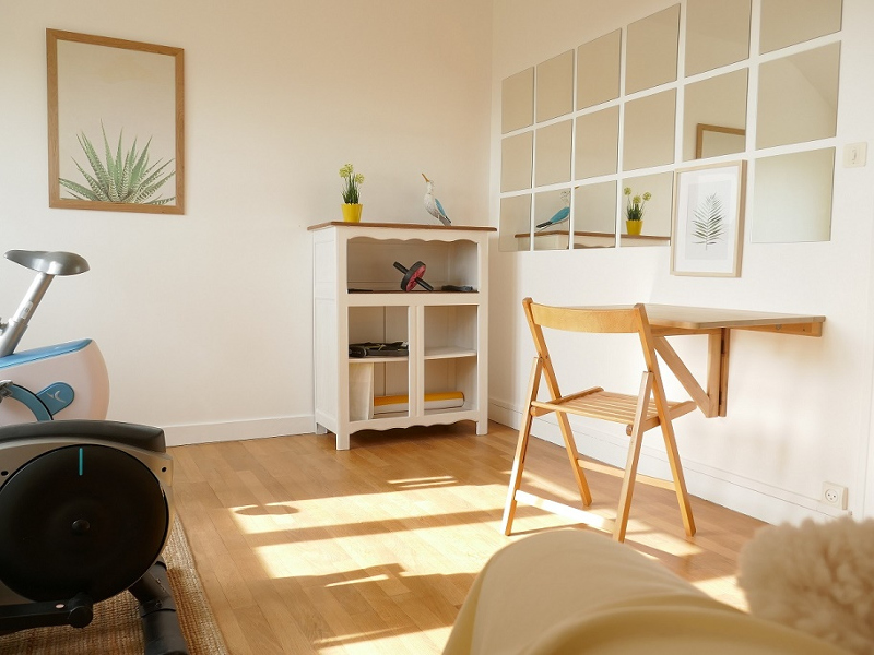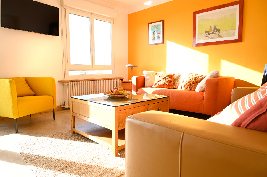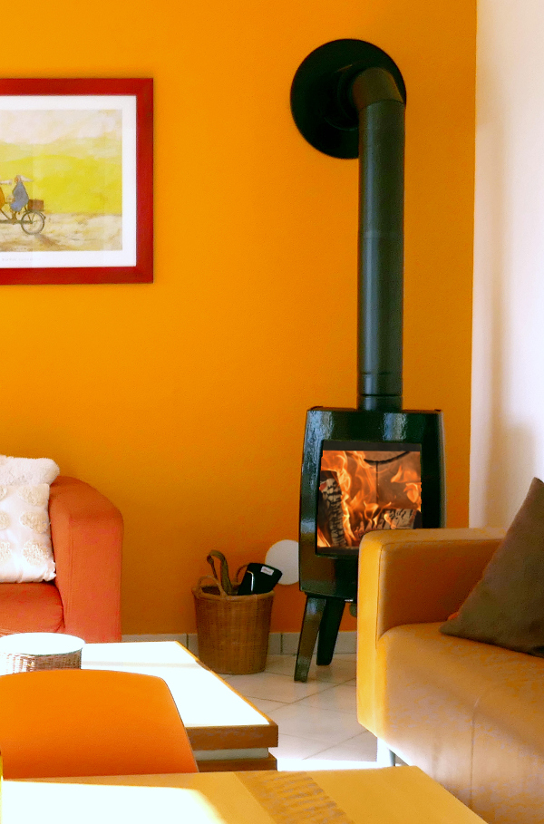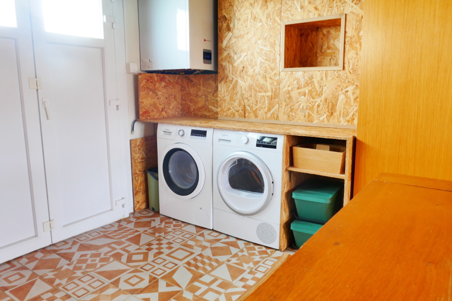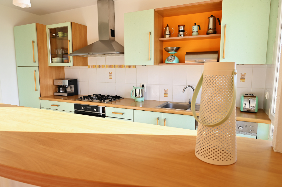 Im Erdgeschoss befinden sich auf 60 m² ein Wohnzimmer mit einem Kaminofen und Terrassenzugang, eine Küche, zwei Schlafzimmer und ein Badezimmer mit bodentiefer Regendusche und Toilette. Die Küche ist vollständig ausgestattet : Kühlschrank mit Gefrierfach, Spülmaschine, modernes Gaskochfeld mit elektrischer Zündung, Dunstabzug, Backofen, Kaffeemaschine, Kaffeemühle, Wasserkocher, Toaster, Küchenmaschinen, Gewürze und Geschirrtücher. Eine Waschmaschine und ein Wärmepumpentrockner stehen in dem an die Küche anschließenden Vorraum zur Verfügung.