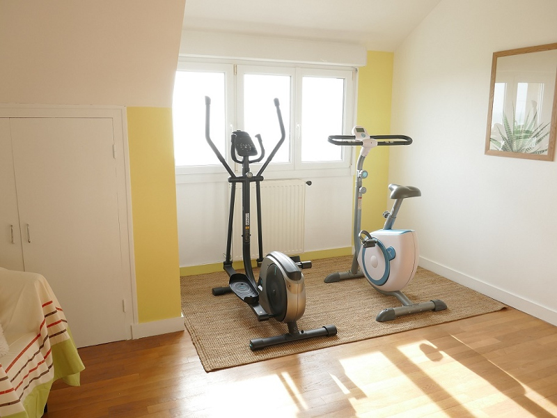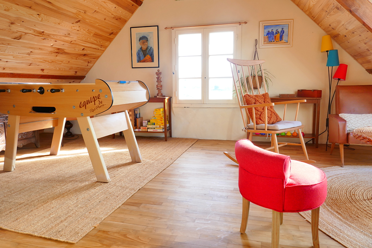 Im Spielzimmer im Obergeschoss lädt ein massiver René Pierre Kicker zu ausgelassenen Spielstunden ein. Brett- und Gesellschaftspiele aller Art sind auch reichlich vorhanden. Außerdem befindet sich hier die kleine Bibliothek des Hauses sowie eine zum Meer hin ausgerichtete Leseecke. Der Fitnessraum liegt ebenfalls oben zum Meer und ist mit einem Crosstrainer und einem Ergometer ausgestattet. Auch diverse Fitness-Kleingeräte wie Kurzhanteln, Gewichtsmanschetten, Bauchroller und Matten... stehen bereit. Im Musikzimmer steht ein Digitalpiano mit 88 Tasten und Sustain-Pedale, dessen gewichtete Hammertastatur für ein authentisches Spielgefühl sorgt.