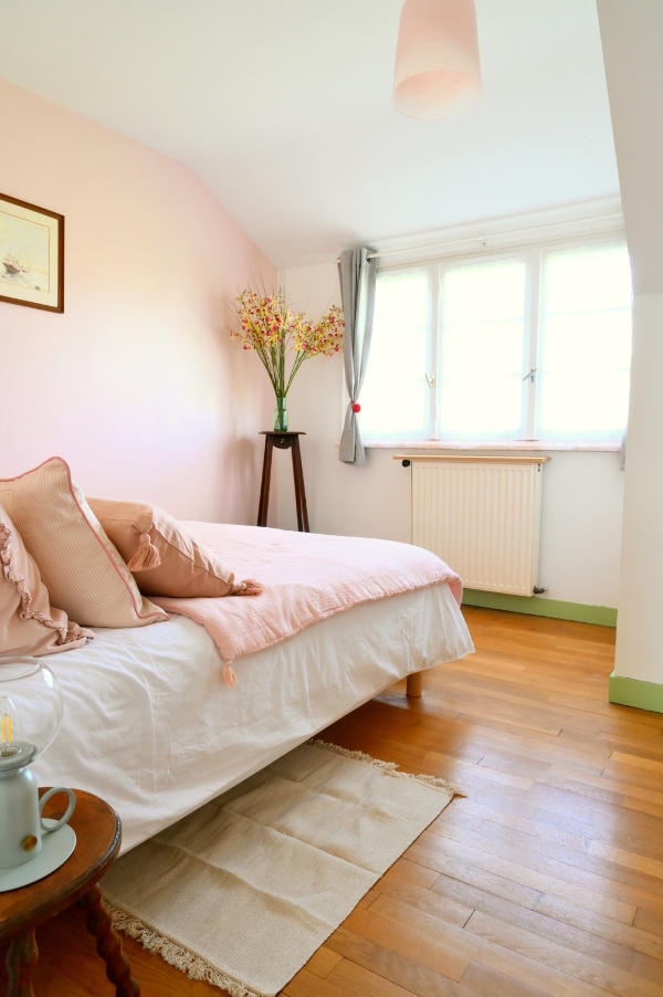 Vom Vorraum mit Garderobe führt eine sichere Holztreppe in die obere Etage. Hier liegt ein weiteres Schlafzimmer, das mit Doppelbett (160 x 200 cm), eine Kommode, eine Wandgarderobe sowie einem bretonischen Schreibtisch am Fenster zum Meer eingerichtet ist. Daneben gibt es ein Badezimmer mit seitlichem Meerblick, Badewanne und einer weiteren Toilette.